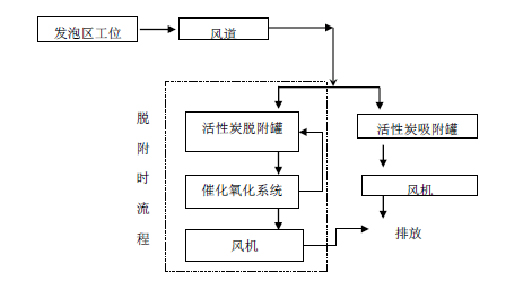 本項目采用“收集+預(yù)處理+活性炭吸附、脫附裝置處理+催化燃燒”主要包括以下兩個部分: 1)經(jīng)過預(yù)處理后的廢氣,經(jīng)活性炭吸附系統(tǒng)處理后通過排氣筒高空排放。 2)活性炭飽和后利用熱空氣進行脫附,脫附后氣體經(jīng)過催化氧化系統(tǒng)進行進一步處理凈化后排放。